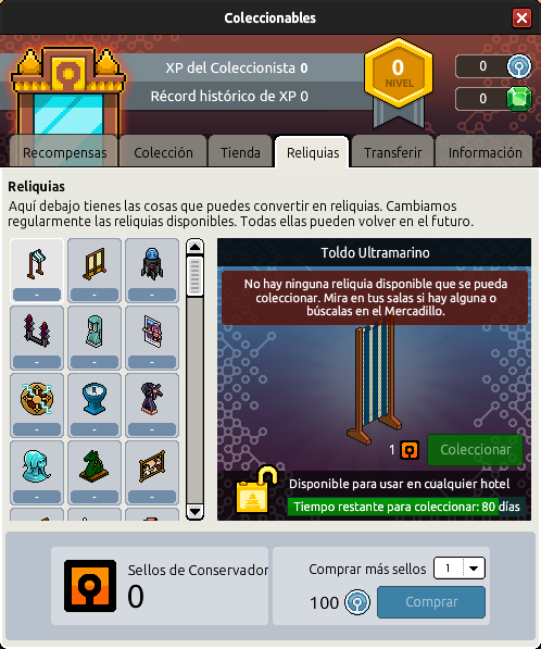 20 Reliquias disponibles para su conversión. Para poder hacerlo, necesitarás poseer en tu inventario el furni/raro que desees y la cantidad de