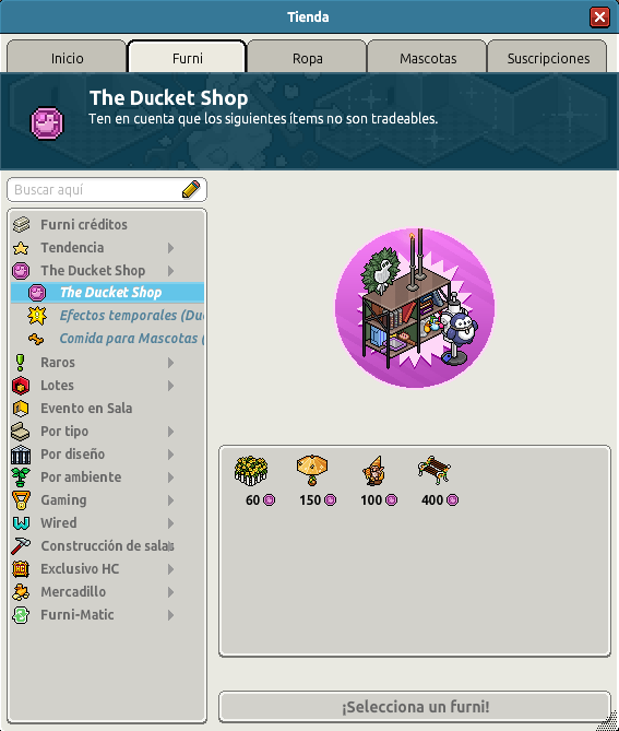 La categoría de "The Ducket Shop" se actualiza para recibir cuatro nuevos furnis con temática de la campaña de Primavera. Para encontrar esta categoría, tendrás que ingresar al apartado Furni » The Ducket Shop » The Ducket Shop. Sus precios varían entre los 60 a 400 Duckets. A continuación te los enseñaremos.