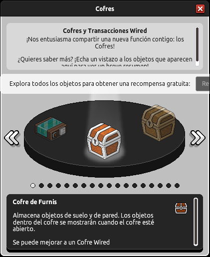 Al ingresar al hotel, en la parte derecha podrás observar la notificación "¡Reclama tu cofre gratis!" y, al hacer clic en ella, se abrirá el apartado de Cofres donde podrás ir explorando todos los furnis Wired que estarán disponibles en esta actualización. Al verlos todos, se habilitará el botón de Reclamar. ¡Haz clic en él para recibir el cofre y una placa exclusiva! A continuación te mostramos cómo hacerlo.
