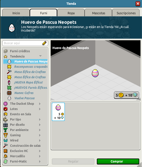 Ya puedes adquirir el furni crackeable, Huevo de Pascua Neopets, desde el apartado Furni » Tendencia » Huevo de Pascua de Neopets a un precio de 5 créditos + 10 diamantes. ¡Estará disponible durante 24 horas todos los martes del mes de abril! Una vez usado, recibirás al azar uno de los furnis de su contenido. ¡A continuación te mostramos los detalles!