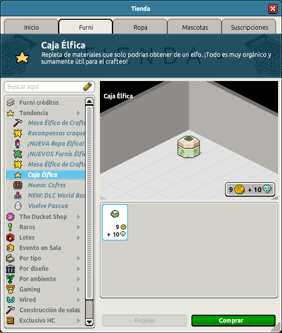 Puedes adquirir el furni crackeable, Caja Élfica, desde el apartado Furni » Tendencia » Caja Élfica a un precio de 9 créditos + 10 diamantes. ¡Estará disponible durante 24 horas todos los lunes del mes de abril! Una vez usado, recibirás al azar uno de los packs de furnis de su contenido. ¡A continuación te mostramos los detalles!