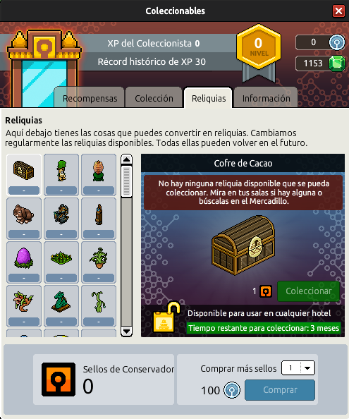 20 Reliquias disponibles para su conversión. Para poder hacerlo, necesitarás poseer en tu inventario el furni/raro que desees y la cantidad de