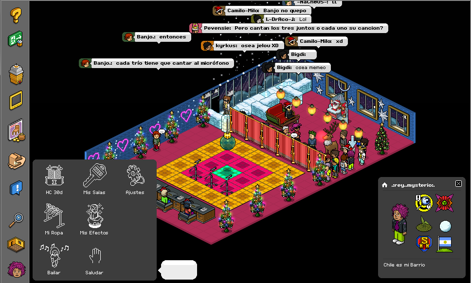 El juego trataba de lo siguiente: se dividían los Habbos en grupos de tres personas. Por turnos, cada grupo se situaba en el centro del escenario y un jurado compuesto por tres Bots que calificaban tu actuación. Según las palabras que dijeras en tu villancico, el Bot diría ‘muy biení, íbiení , ‘pasableí. El grupo que más halagos tuviera sería el ganador. Los ganadores se llevarán un Set de Navidad.