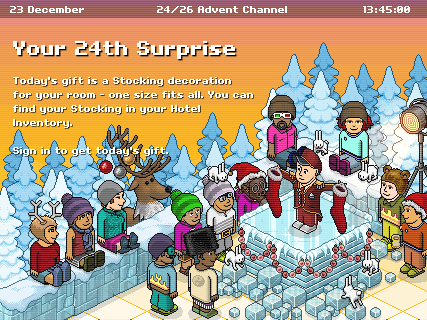 El regalo de hoy es un Calcetín de Navidad para tu Sala ñ una única talla para todo el mundo. Tu puedes encontrar tu Calcetín de Navidad en tu inventario del Hotel.