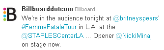 Y como se esperaba, las ventas del disco subieron un poco ahora que ya empezó el tour! Femme Fatale vendió 13,790 copias esta semana en USA. Aparecerá en el puesto #28 este jueves en el HOT 200 de Billboard.
