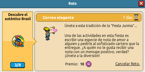 4. Correo elegante Únete a esta tradición de la "Festa Junina"...Una de las actividades en esta fiesta es escribir una especie de nota de amor a alguien y pedirle al sofisticado cartero que la entregue. ¿A quién no le gusta recibir una nota con un mensaje positivo, verdad? ¡Únete a la diversión! Deja 5 notas en la sala de otro Habbo donde se encuentre el "Poste para Notas".