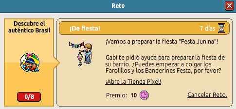1. ¡De fiesta! ¡Vamos a preparar la fiesta "Festa Junina"!Gabi te pidió ayuda para preparar la fiesta de su barrio. ¿Puedes empezar a colgar los Farolillos y los Banderines Festa, por favor? Pon dos veces el furni "Farolillo Festa"o "Banderines Festa" en una sala desde tu inventario (deberás comprarla o prestarla).