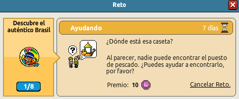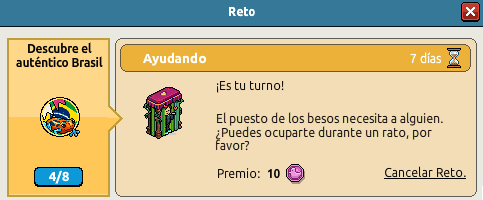 7. Haciendo nuevos amigos ¡La amistad lo es todo!Es bastante fácil hacer amigos en Brasil. ¿Qué tal si haces algunos nuevos amigos mientras estás aquí? Envía 5 peticiones de amistad a otros Habbos. Por completar este reto recibirás 1 día de HC para el próximo.