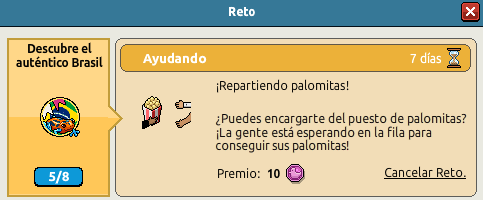 6. Ayudando ¡Repartiendo palomitas!¿Puedes encargarte del puesto de palomitas? ¡La gente está esperando en la fila para conseguir sus palomitas! Obtén Palomitas usando el furni "Carrito de Palomitas" y pasa 5 Palomitas a otros Habbos.