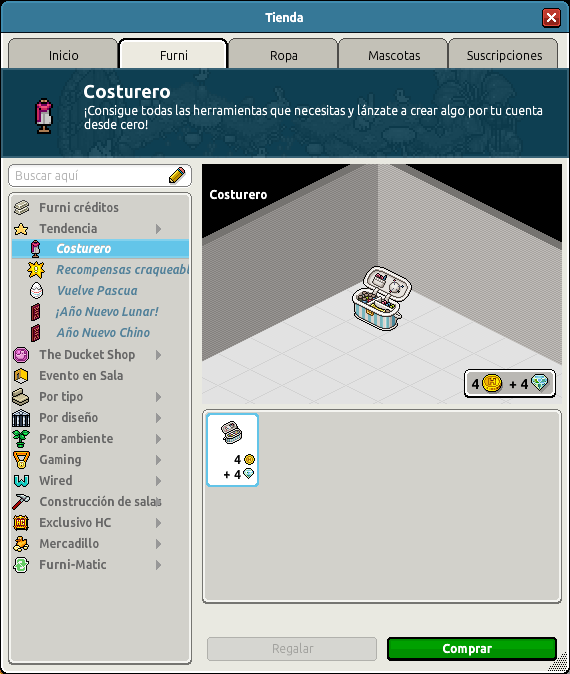 Ya puedes adquirir el furni crackeable, Costurero, desde el apartado Furni » Tendencia » Costurero a un precio de 4 créditos + 4 diamantes. ¡Estará disponible durante 24 horas todos los martes del mes de marzo! Una vez usado, recibirás al azar uno de los packs de ítems de su contenido. ¡A continuación te mostramos los detalles!