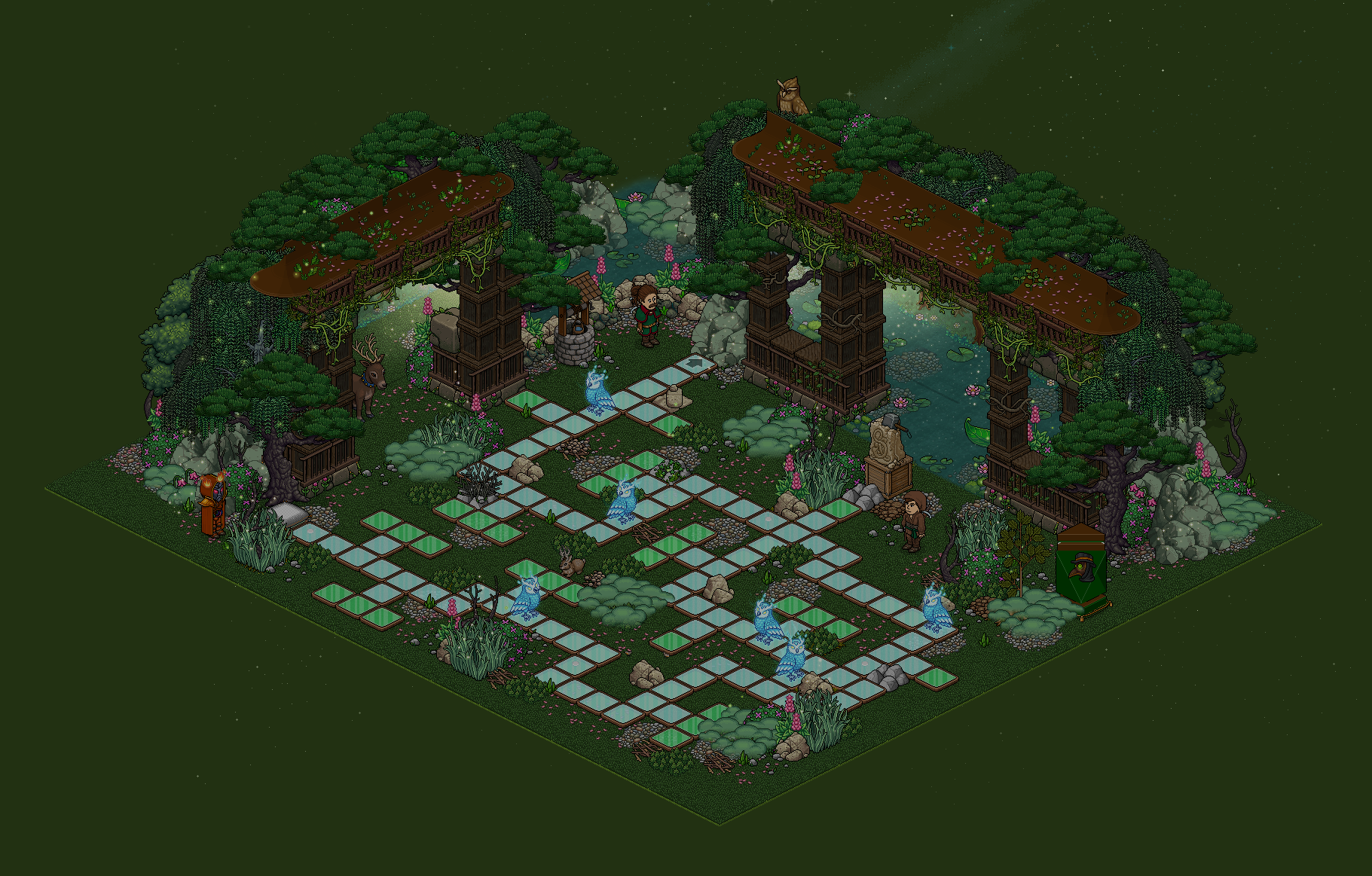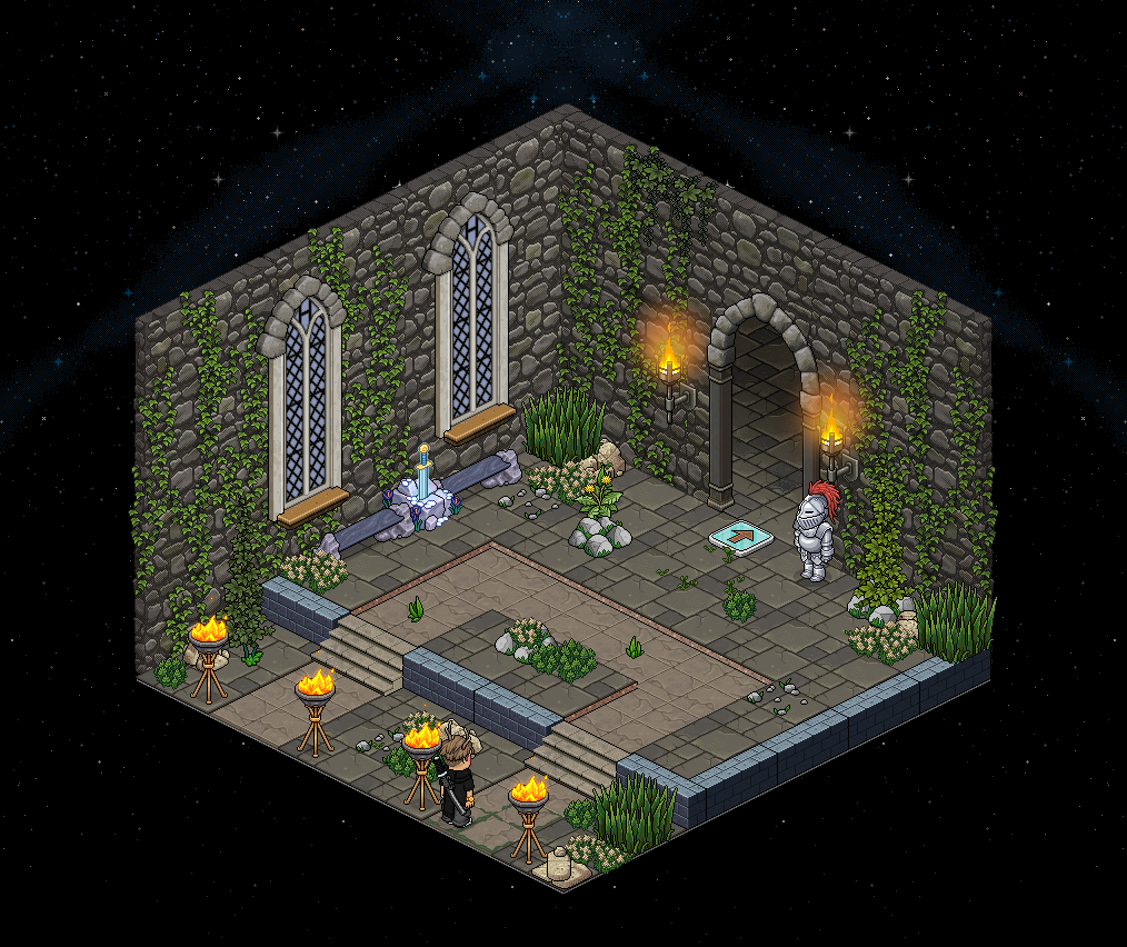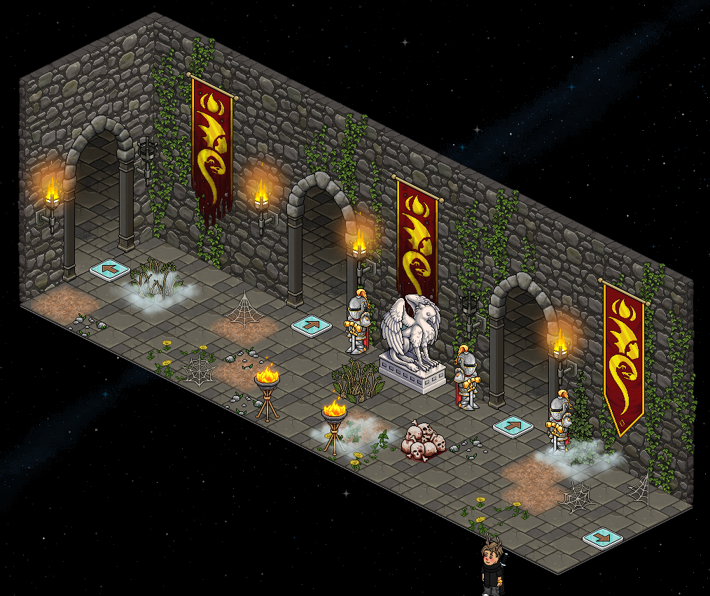 La sala y el juego han sido creadas por Schtroumpfette & assdraco. Una vez sea tu turno, deberás completar dos pruebas: la del arquero y la del espadachín en menos de dos minutos. Sigue todas las indicaciones que te dará Oni durante el transcurso del juego. Al superar ambas pruebas, sitúate enfrente de la Estatua de Guerrero de Bronce y escribe la siguiente frase: ¡Quiero ser un guerrero!