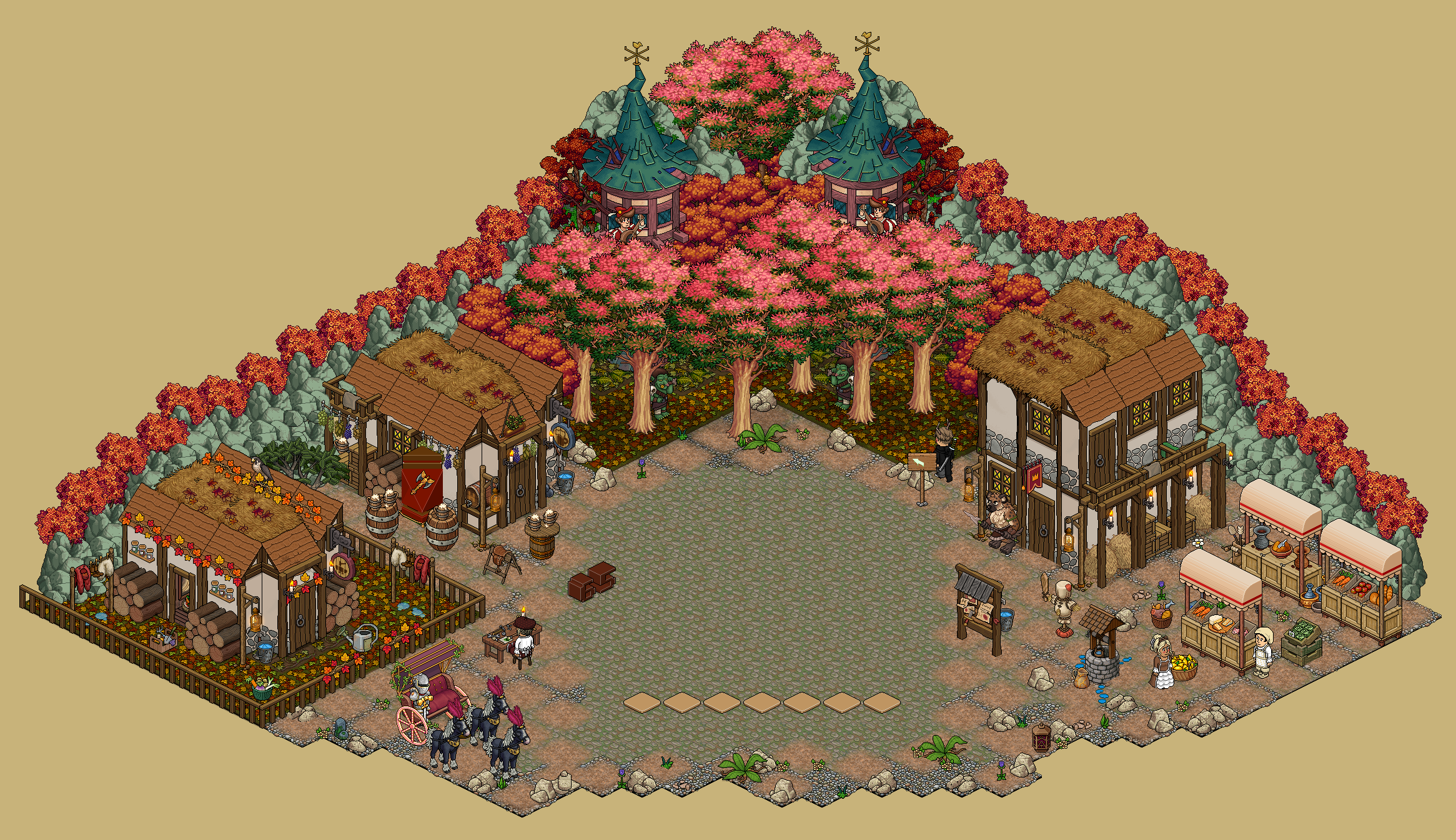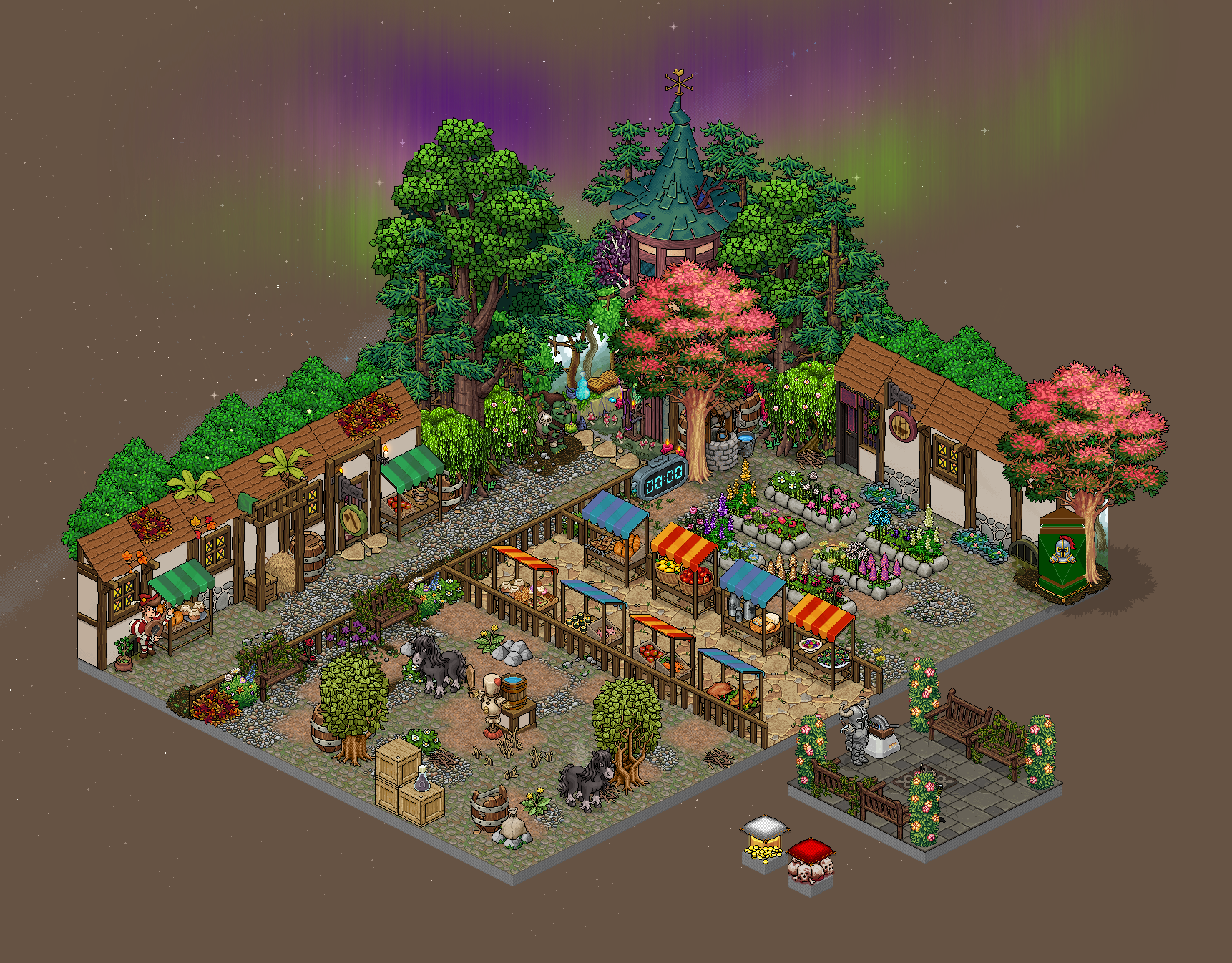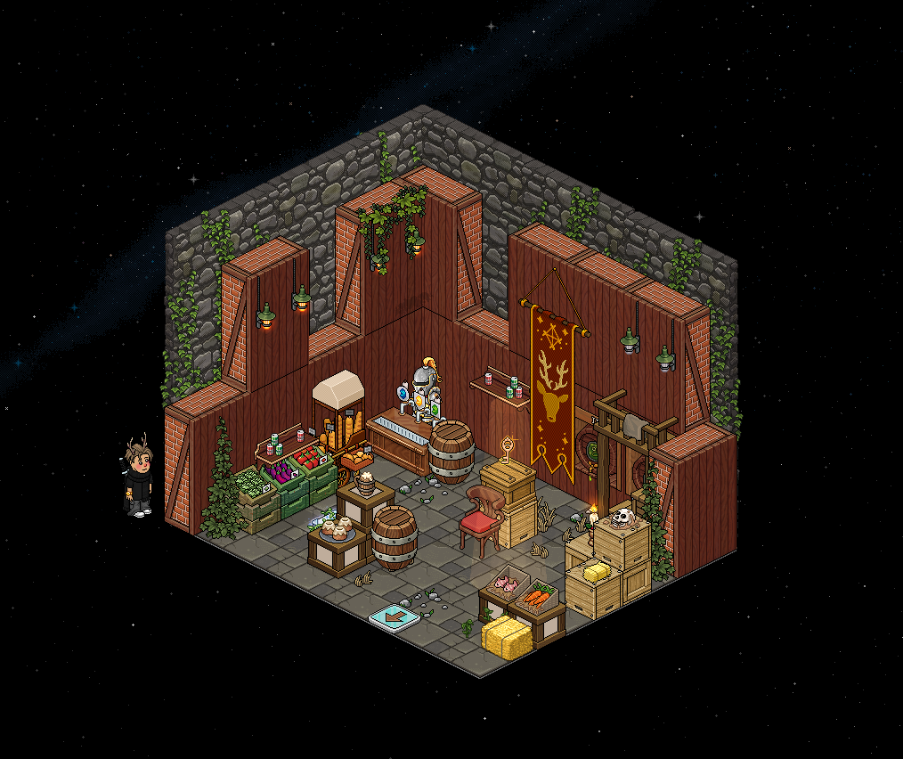 Mercado: En un periodo de unos cuantos segundos, unos furnis se levantarán por aproximadamente 1 segundo, en un orden concreto. Memoriza este orden, y haz clic en ellos en dicho orden cuando sea tu turno. Será una secuencia diferente para cada jugador. Si fallas, podrás repetirlo hasta que finalice el tiempo.